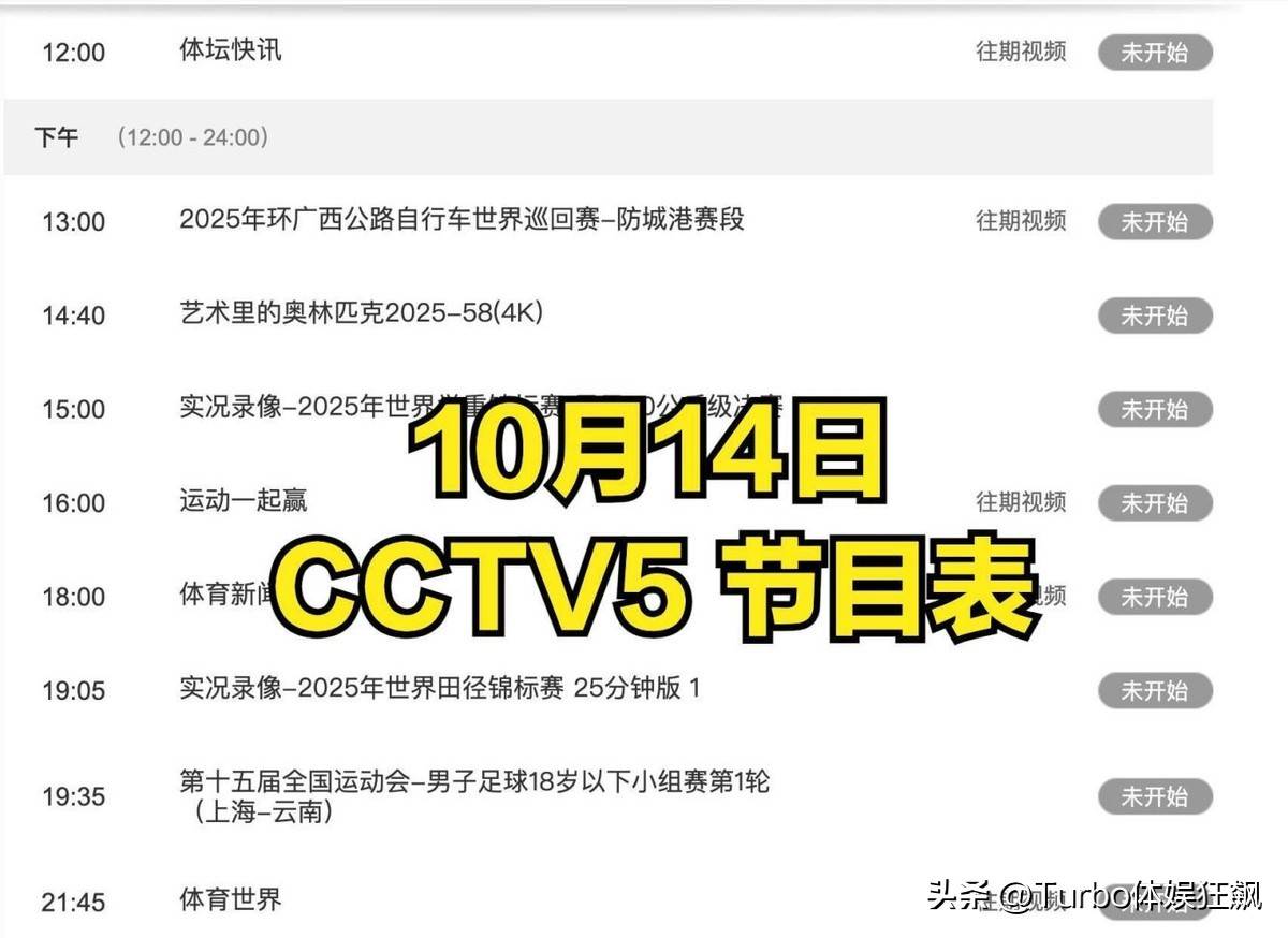 根据央视公布的节目单,10月14日CCTV5主要安排了自行车赛事和全运会相关直播。 下午时段直播环广西公路自行车赛,晚间黄金时间则留给了全运会男子足球U18小组赛。