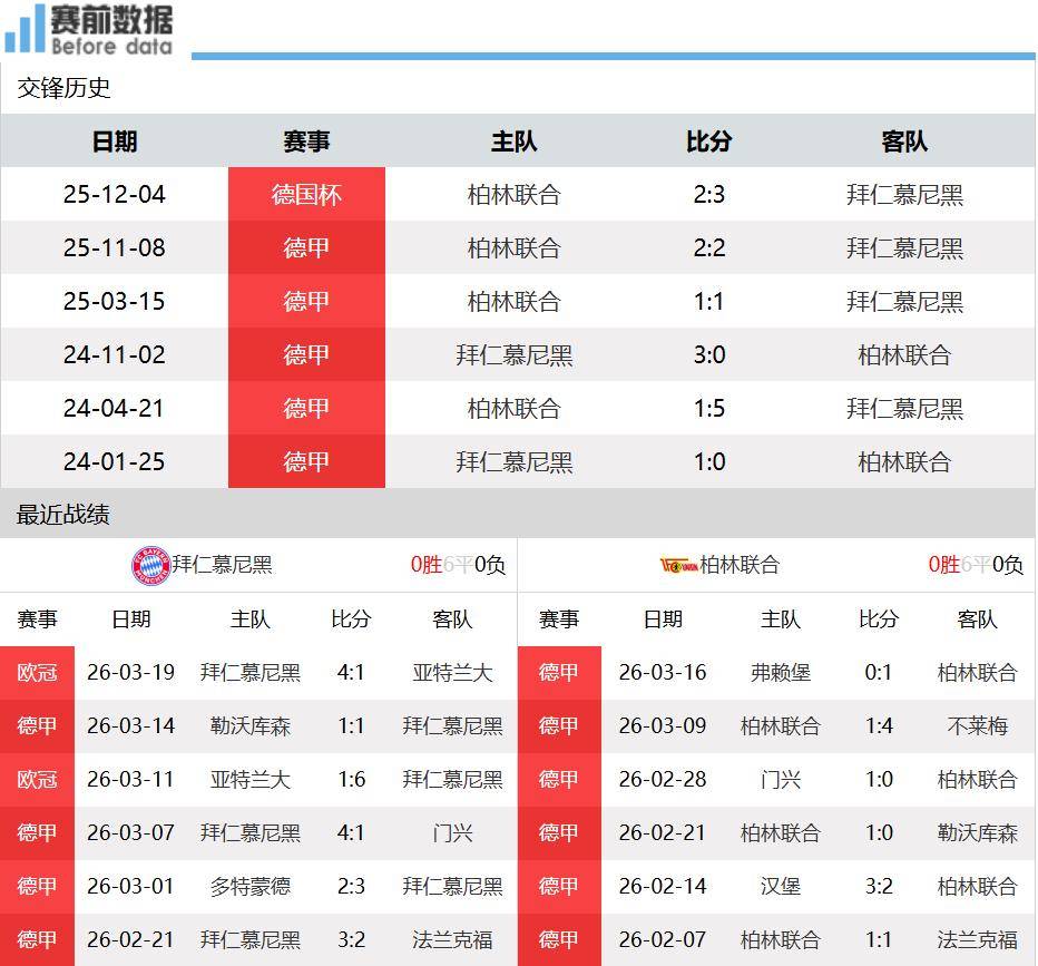 第一:两队情况!德甲26轮战罢,拜仁21胜4平1负积67分排名第一,9分优势领跑,柏林联合8胜7平11负积31分排名第九。上轮德甲,9人拜仁客场1-1战平勒沃库森,各项赛事7连胜遭终结,周中欧冠主场4-1大胜亚特兰大轻松晋级欧冠8强;柏林联合客场1-0小胜弗莱堡,止住了联赛两连败。