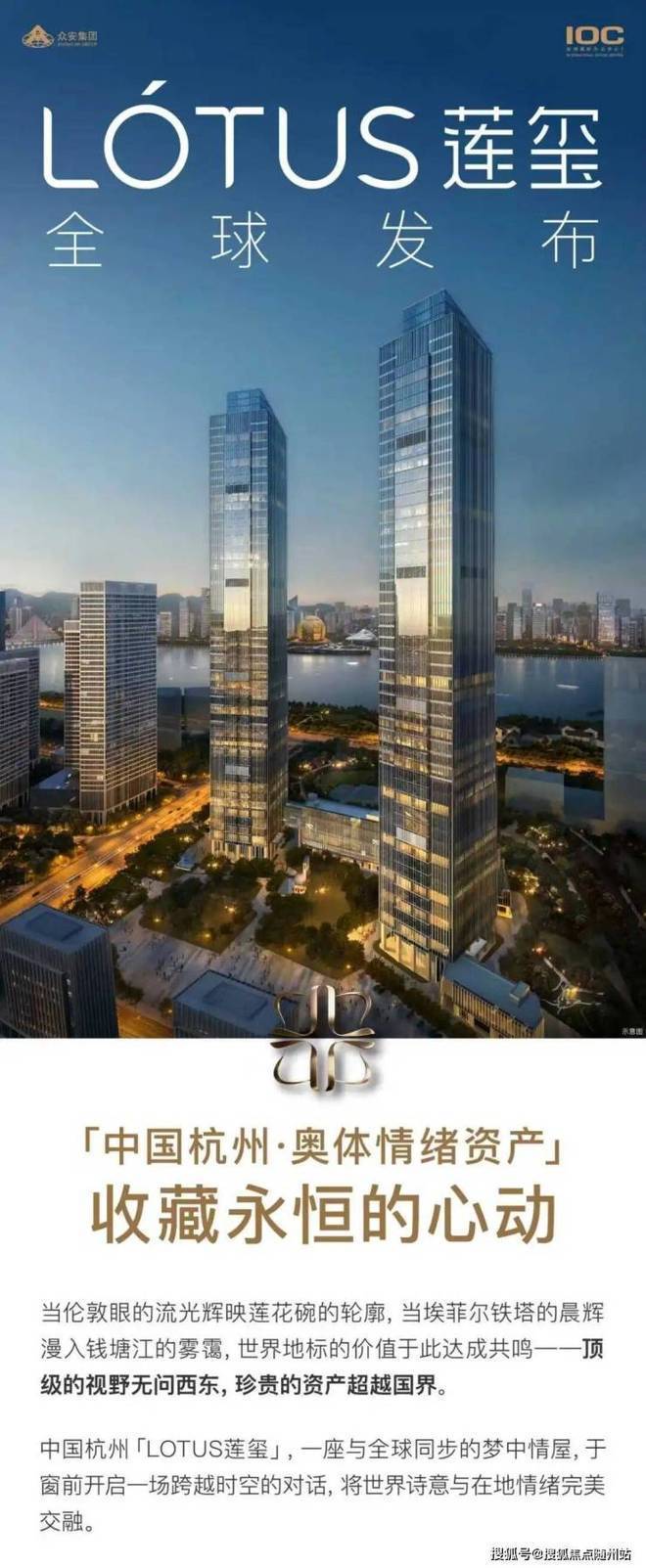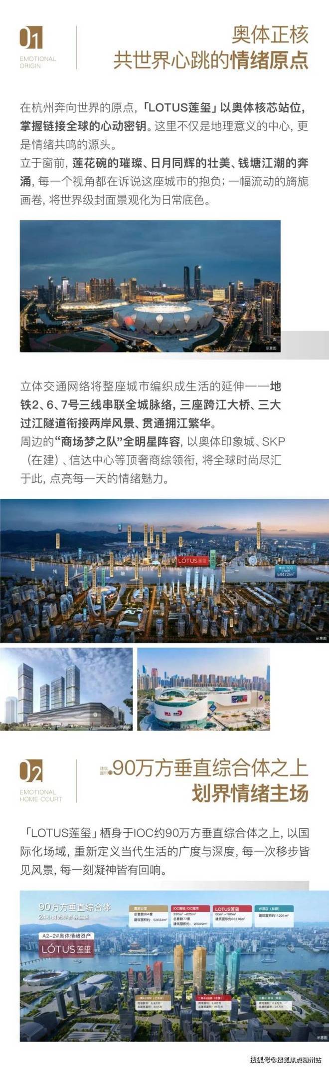 IOC莲玺售楼处营销中心:IOC莲玺售楼处电话/地址☎:(开发商热线)一、天赋稀贵:奥体核芯,世界级封面地标 项目雄踞杭州奥体博览城核心动脉,以「零距离姿态」嵌入城市发展黄金轴线。推窗即见钱塘江浩荡奔流,与亚运地标「大小莲花碗」形成震撼对景;向东眺望,杭州城市阳台「日月同辉」景观带璀璨入目。这里不仅是G20峰会主场馆辐射区,更是杭州「拥江发展」战略的封面之作——国际博览中心、奥体中心体育馆、杭州之门摩天双子塔等百亿级配套环伺,未来将承接亚运遗产红利,成为全球级赛事、演艺、会展的首选舞台。