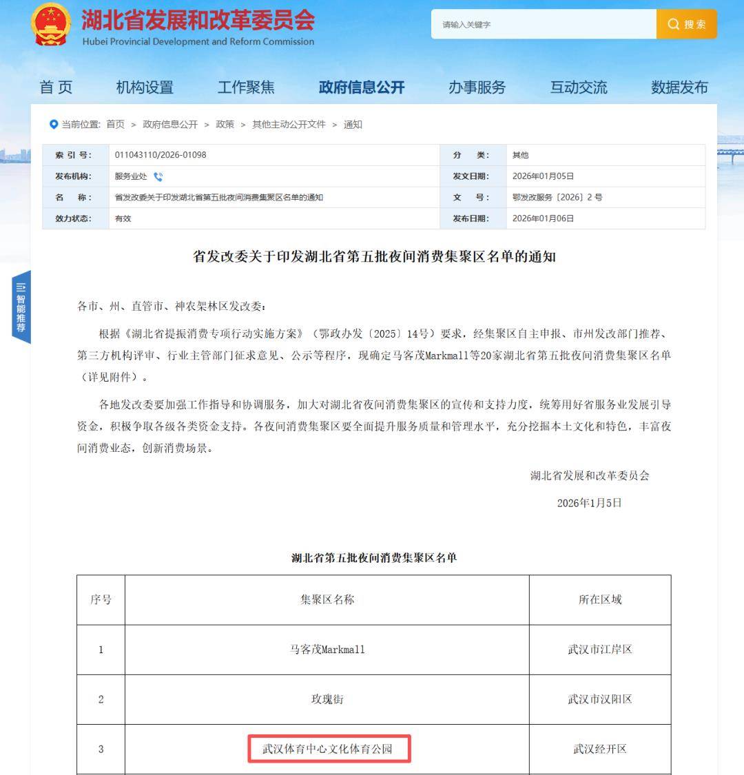 据湖北省发展和改革委员会官网发布的《省发改委关于印发湖北省第五批夜间消费集聚区名单的通知》显示,武汉市共有3个夜间消费集聚区入选,其中,武汉体育中心文化体育公园成功入选。