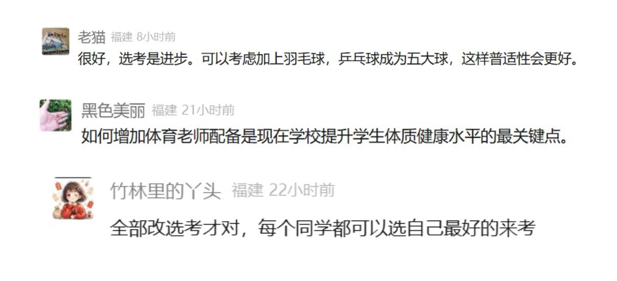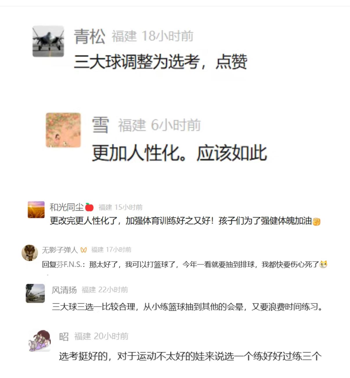 有网友直言,“三大球调整为选考,点赞”。不少家长和学生表示,以往“抽考三大球”可能让不擅长某一项目的孩子陷入焦虑,选考模式更贴合学生个体差异,能更好地激发锻炼积极性,助力体质提升。